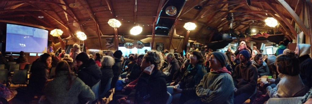 Dimanche, après une balade musicale dans le froid mais la bonne humeur ( peut-être dû au pommeau servi dans la remorque-bar) nous avons terminé la journée au chaud devant un premier court-métrage sur la lutte des paysans indonesiens de Kulon Progo, dont le nom avait été donné à un des dortoirs construits à la Châtaigne en 2012 . La soirée s’est achevée sur le film extraordinaire des Lentillères « Une île et une nuit ».
