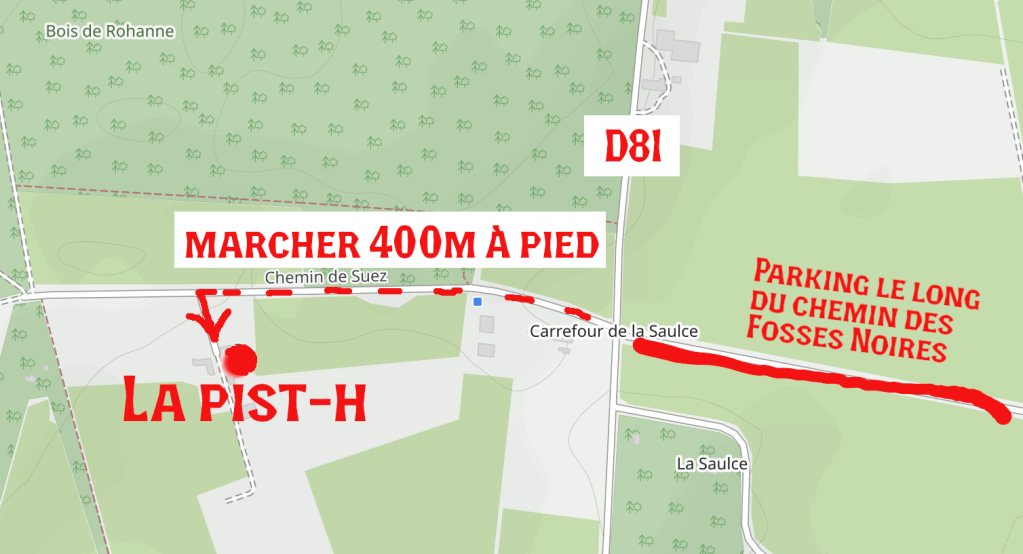 Parking le long du chemin des Fosses Noires, puis marcher 400m jusqu’à la Piste-H.